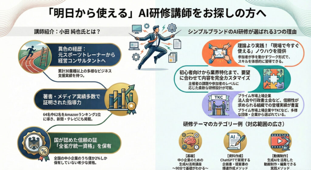 小田じゅん主には「これからAIを取り組まれる方」や「AIの基本を学びたい方」を対象とした研修を実施しております。