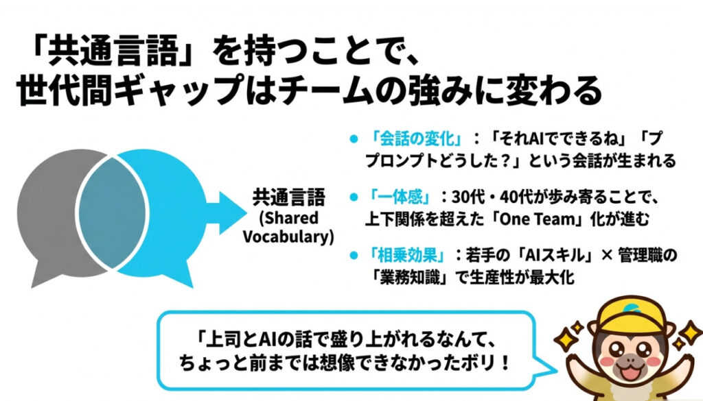 「それAIでできるよね」「この作業、プロンプト工夫した?」といった共通言語が生まれ、上下関係ではなくチームとしての一体感が強まります。
