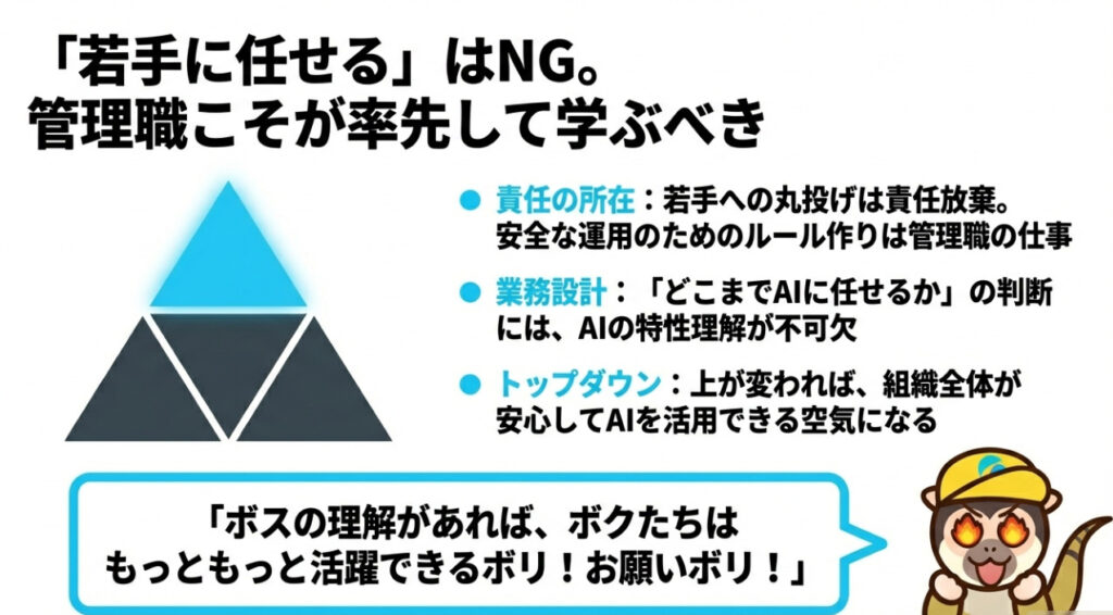 「若い人が詳しいから任せればいい」という姿勢は、責任の押し付けになります。