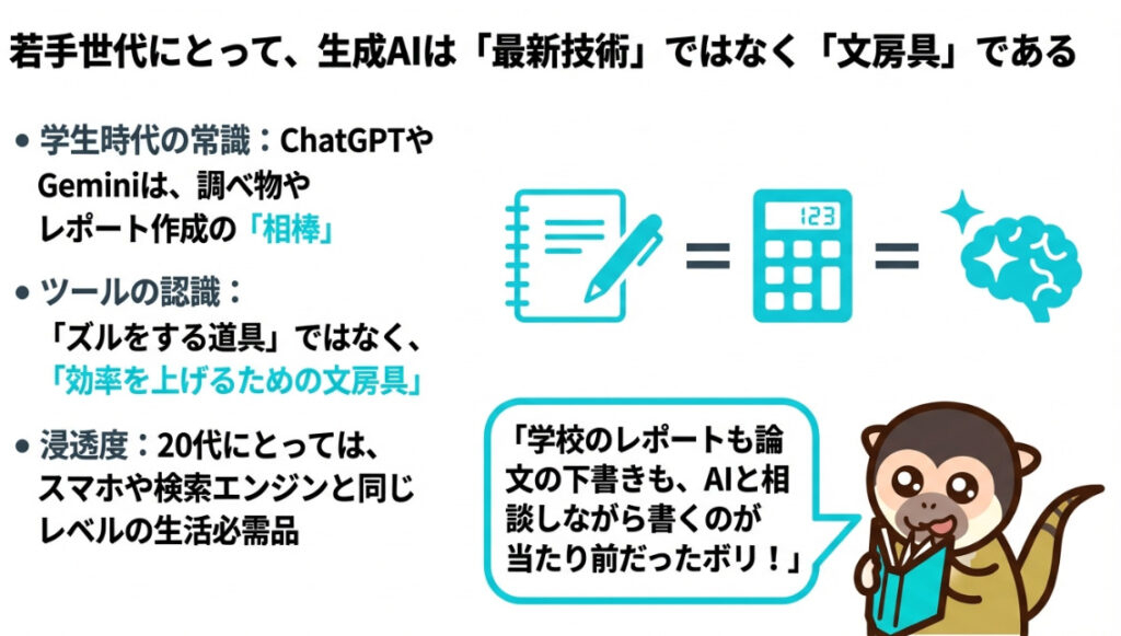 彼らにとって生成AIは「ズルをする道具」ではなく、「効率を上げる文房具」のような存在です。