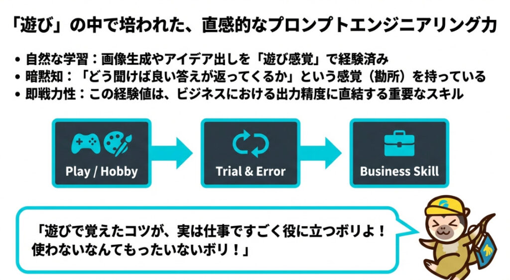 画像生成、文章の言い換え、アイデア出しなどを楽しみながら使うことで、「どう聞けば良い答えが返ってくるか」という感覚を自然に身につけています。