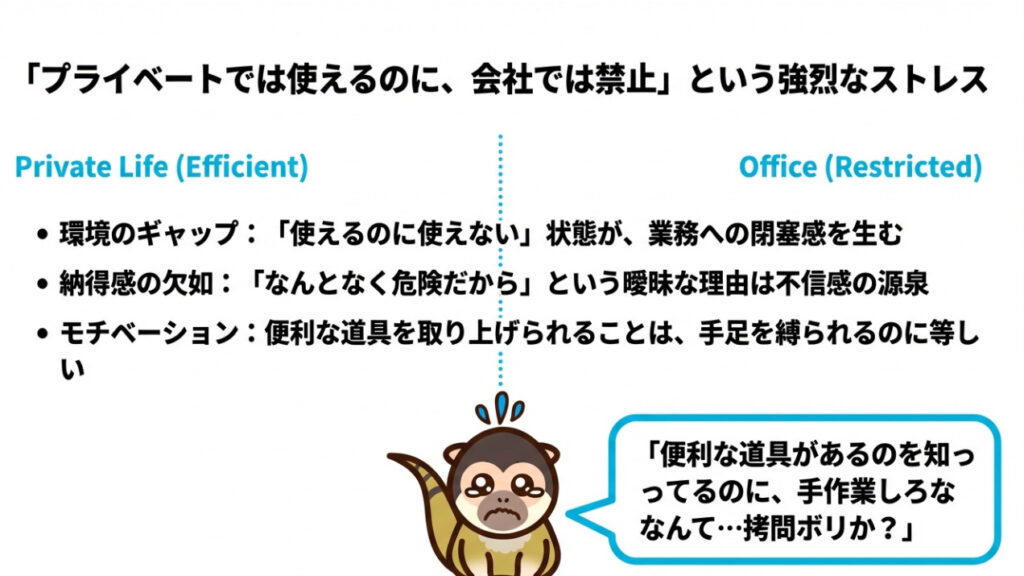 プライベートでは普通に生成AIを使っているのに、会社では「禁止」「使うな」と言われる。