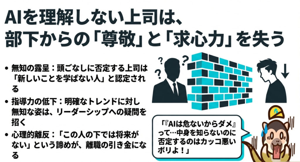 AIという明確なトレンドに対して無知な姿を見せてしまうと、「この人の言うことを聞いても将来につながらない」と判断されやすくなります。
