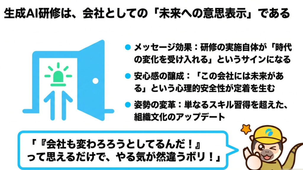 生成AI研修を率先して受講することは、単なるスキルアップではありません。