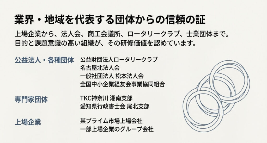 弊社は全国の中小企業を支援してきた実績があり、特に生成AIに関しては、公益財団法人ロータリークラブ、名古屋北法人会様、愛知県行政書士会 尾北支部様、税理士の集まりであるTKC神奈川 湘南支部様 など、お堅い場所での講演実績が多数あります。