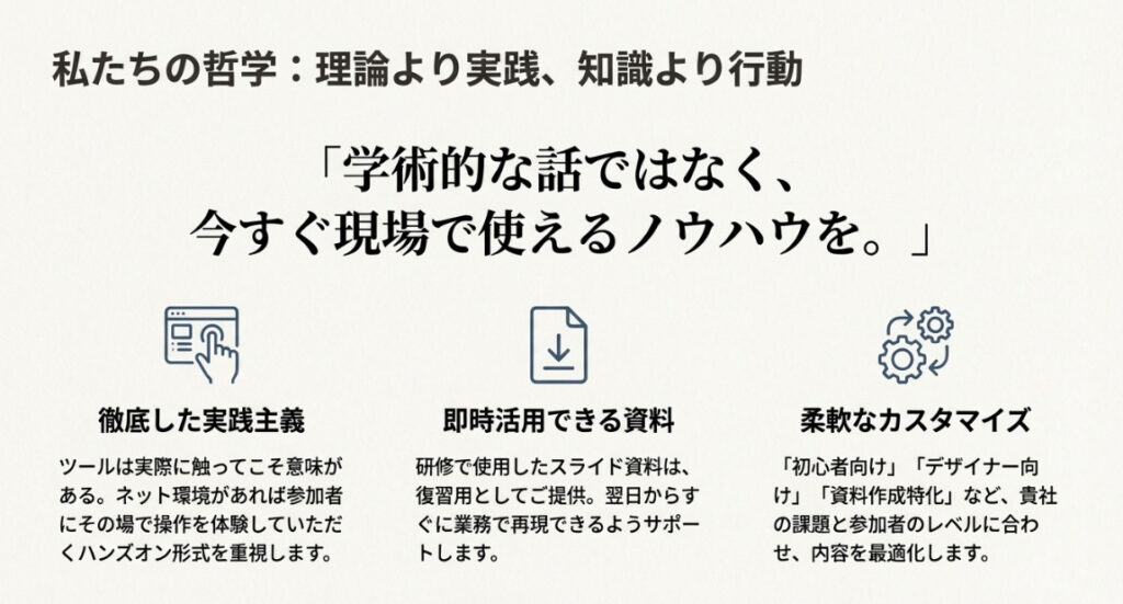 理屈だけでなく、現場で今すぐ活用できるノウハウに特化しており、研修後すぐに業務効率化を始めることができます。