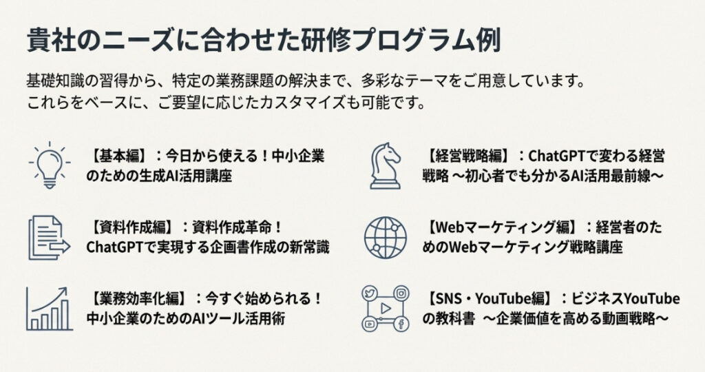 一部上場企業のオフィスでも生成AI研修を実施しており、その内容は高い評価を得ています。