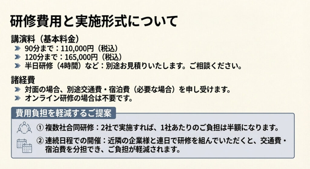 オンライン形式であれば、交通費や宿泊費が不要となり、全国どこからでも効率的に研修を受けていただけます。