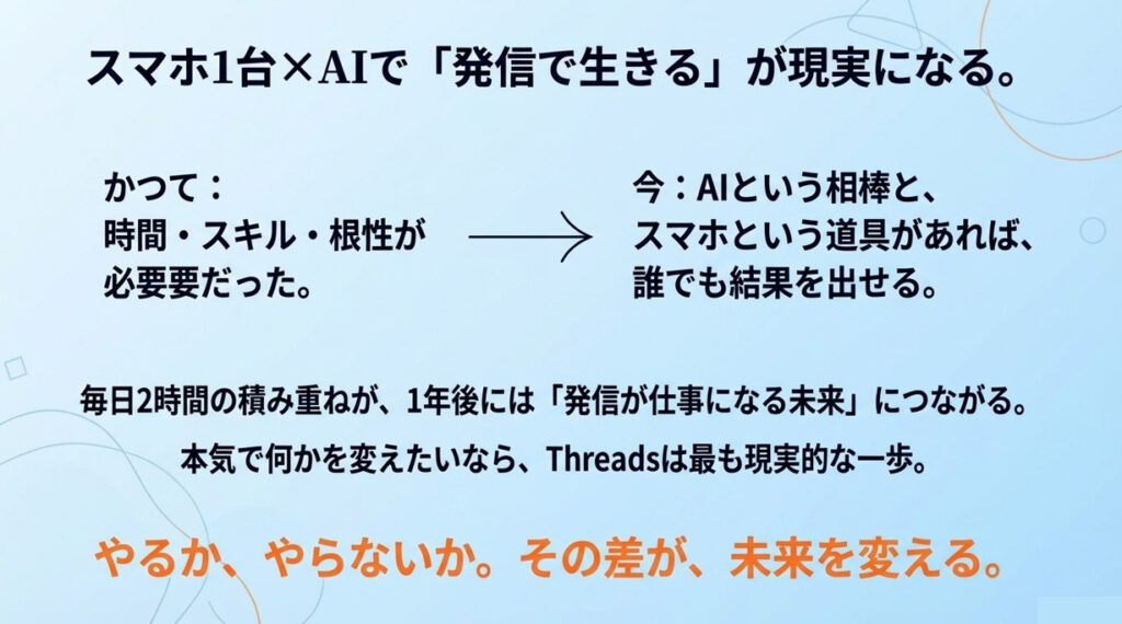 まずは1日1時間、AIとスマホを使ってThreadsの運用を始めてみてください。
