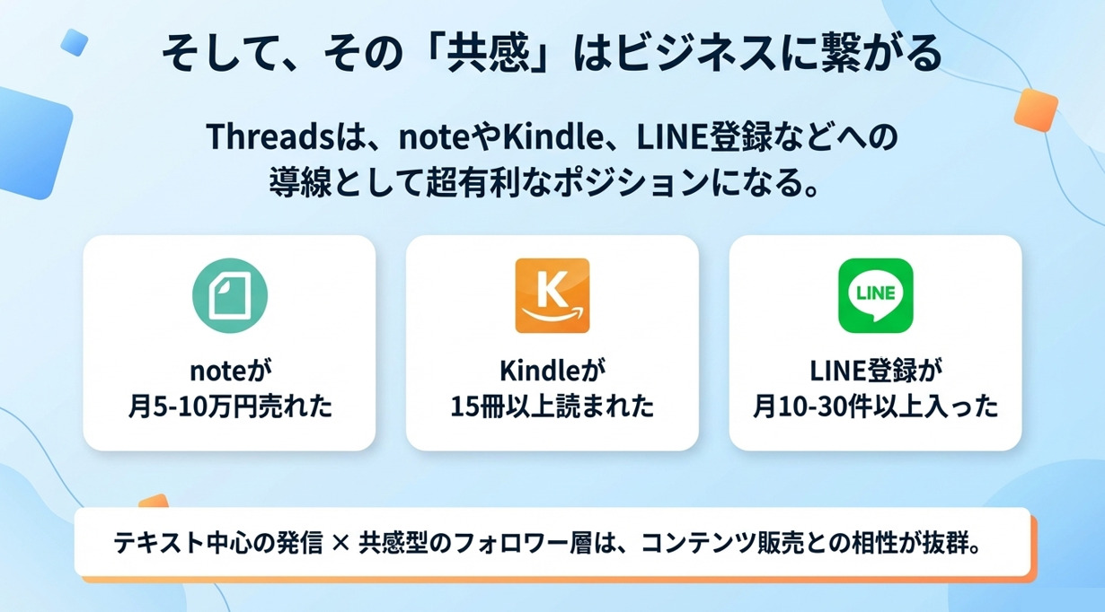 実際に、ThreadsをきっかけにnoteやKindleが売れた事例や、LINEの登録者数が月に1件もなかった状態から10件以上に増え、そこから高単価商品の成約に繋がった事例も存在します。