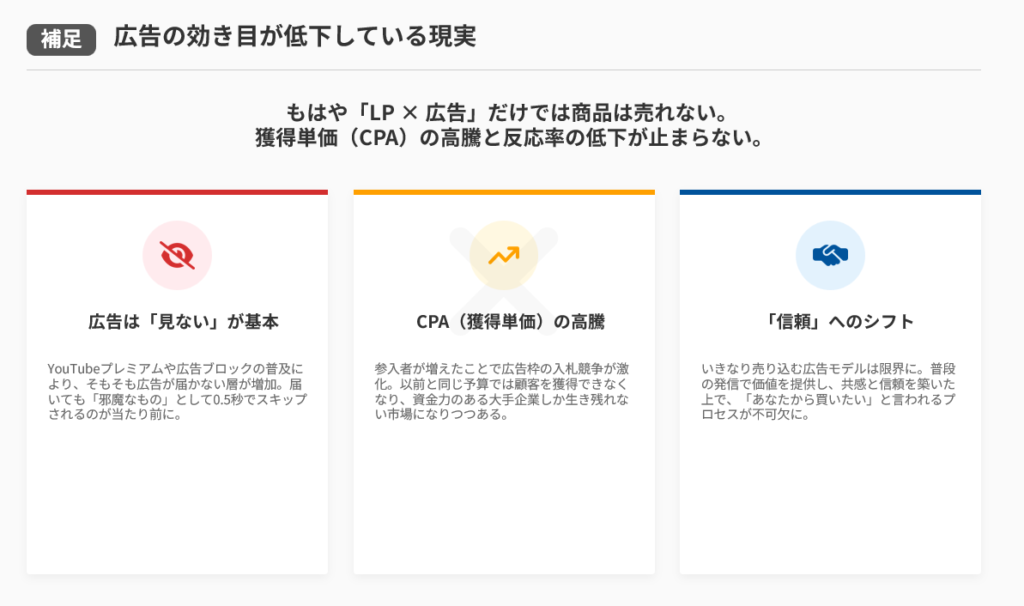 以前のように、LP(ランディングページ)を作って広告を流せば商品が売れるという単純なモデルは崩壊しつつあります。