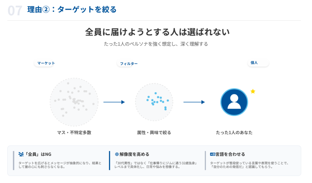 「全員」をターゲットにするのは絶対にNGです。広げすぎると誰にも刺さりません。