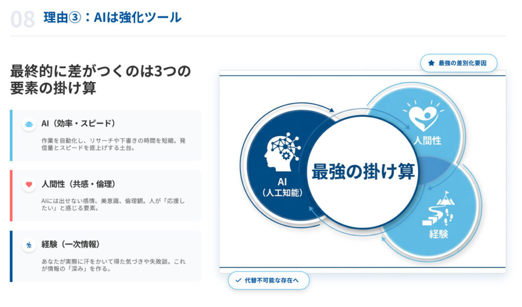 しかし、AIには出せない価値があります。それは以下の3つの掛け算です。