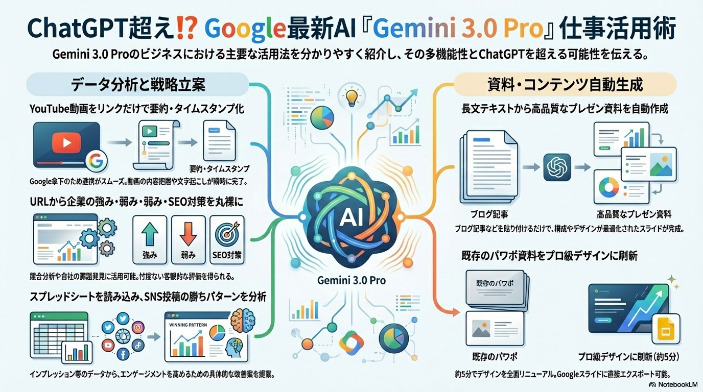 Gemini 3.0 Proは、動画の要約からSEO戦略、データ分析、そしてプロ級のプレゼン資料作成まで、ビジネスの核となる部分で極めて実用的な力を発揮します。