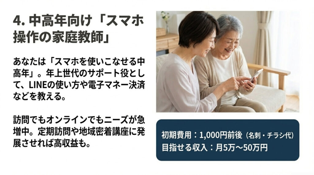 【アイデア4】超初心者向け!中高年をターゲットにしたスマホ操作の家庭教師