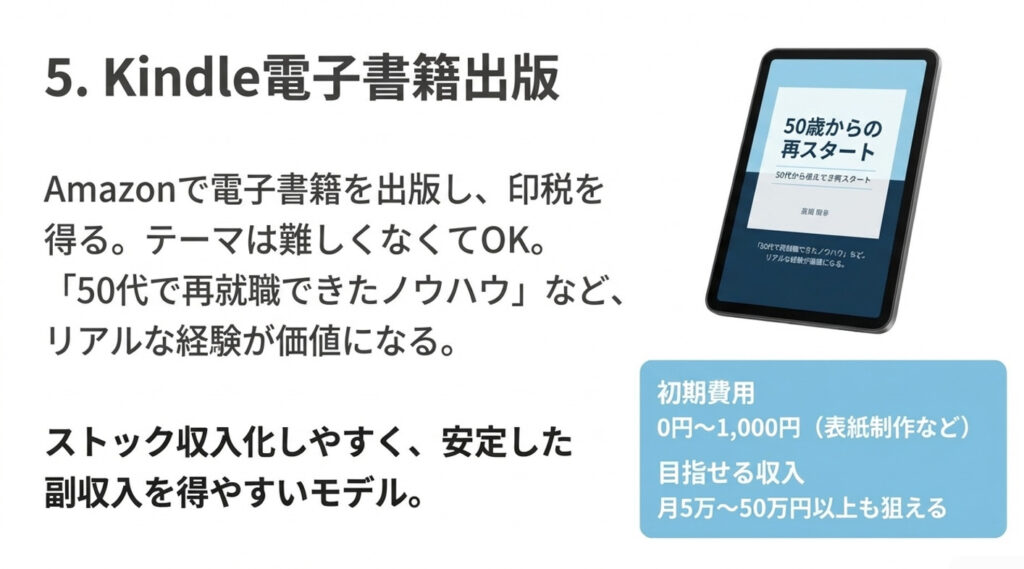 AmazonのKindleで電子書籍を出版し、印税収入を得る方法です。