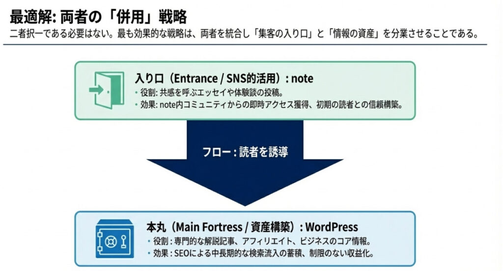この方法なら、noteの「すぐに読まれる」というメリットと、WordPressの「長期的にアクセスが積み上がる」というメリットの両方を活かせます。