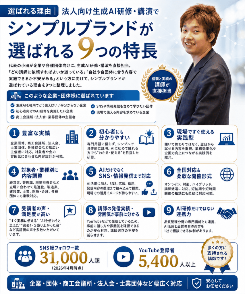 選ばれる理由|法人向け生成AI研修・講演でシンプルブランドが選ばれる9つの特長
